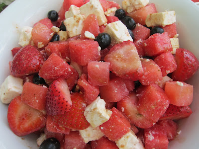 Mix fruit and feta together gently. Add a handful of blueberries and drizzle with balsamic vinaigrette.