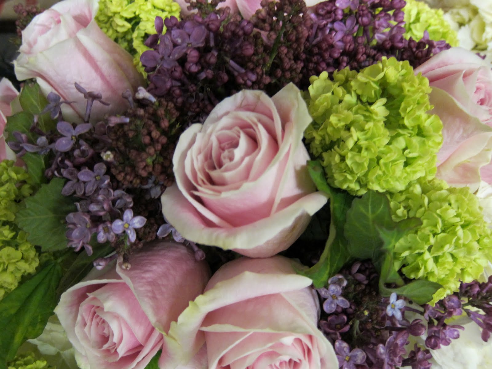 The mix of lilacs (my favorite flower) and roses is soft and romantic