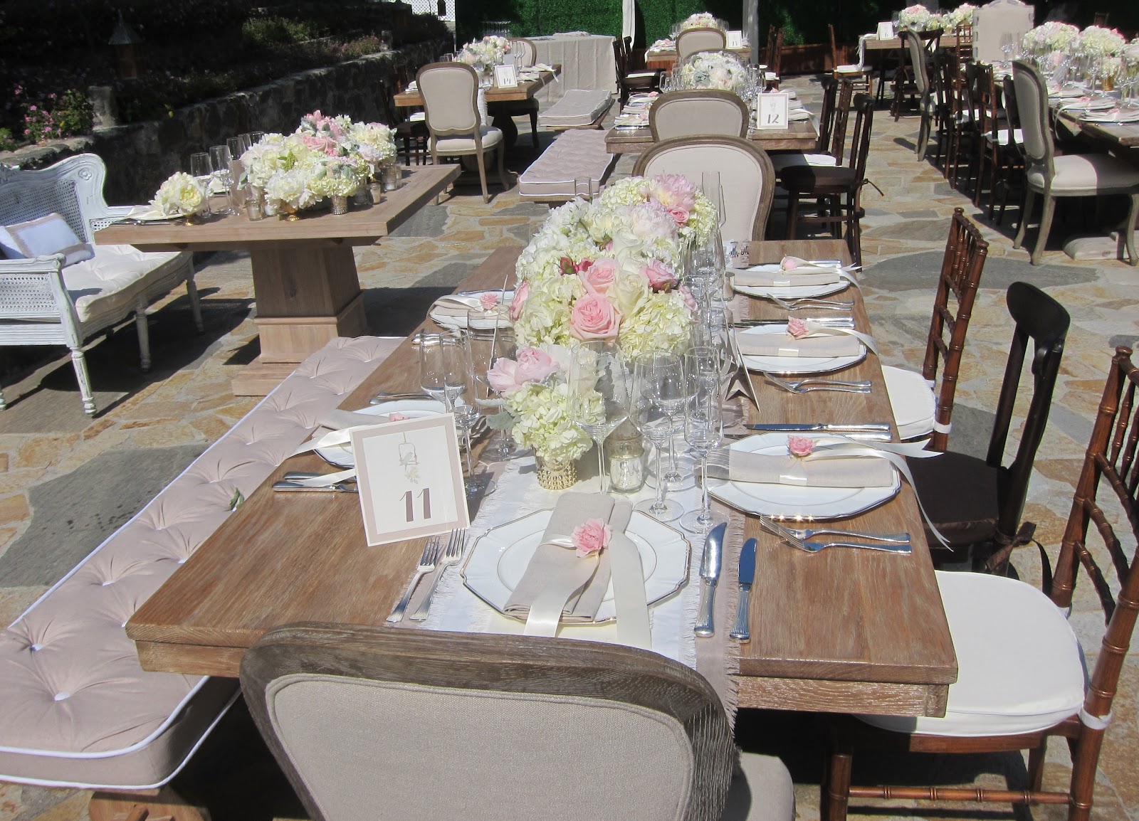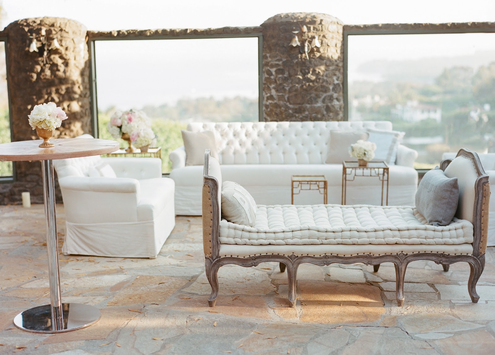 The wedding took place at a lovely Malibu estate overlooking the Pacific Ocean. Marisa and Ezra wanted their wedding to be unique and gorgeous and also very inviting and warm. Every detail was important to them, but they also wanted to be careful to not go over the top in any way. The ceremony took place in a garden overlooking the sparkling ocean. The couple’s good friend served as their officiant and the ceremony was extremely touching, funny and personal. Marisa and Ezra’s love of wine was reflected in their cocktail hour. There were several wine and charcuterie tasting stations placed on rustic wine barrel tables in custom cabanas. Guests dined beneath hanging crystal balls of light on a grand stone courtyard. They sat at wooden tables that were assembled on-site. An eclectic mix of chairs, benches and sofas completed the look.