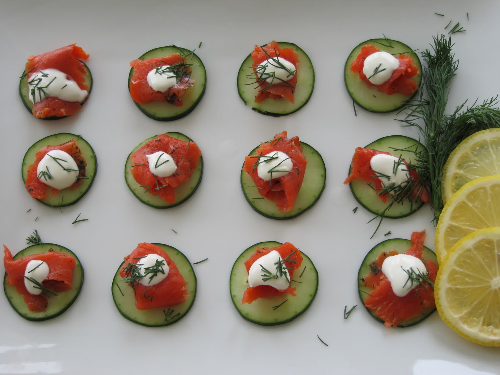 Simply place a few slices of salmon on the cucumber rounds. Add a dollop of creme fraiche and garnish with dill. It’s important to use high quality smoked salmon and fresh dill. Sprinkle dill on your platter and serve with sliced lemon. Enjoy!