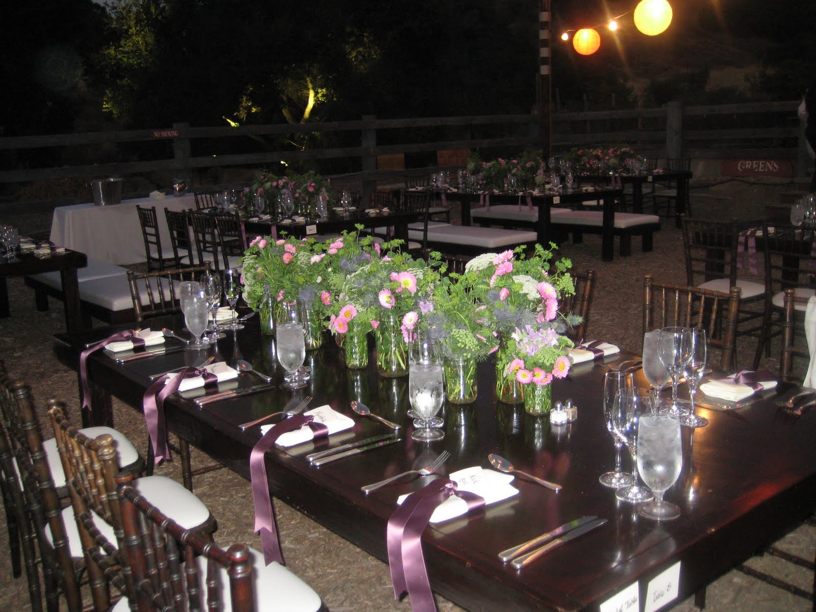 Saturday began with a lovely ceremony at the hotel in the Herb Garden followed by cocktails and hors d’ oeuvres under the wisteria covered pergola. Guests hopped on shuttles and were whisked to a “secret” location. They were delighted to arrive at the Ranch owned by the resort. After dining outdoors on Amalfi tables overflowing with wild flowers – a new area was revealed. We transformed the existing barn into an eclectic lounge combining colorful Indian accents and old world European decor. The fantastic space featured custom furniture, dramatic lighting and floor to ceiling draping. Guests danced the night away.